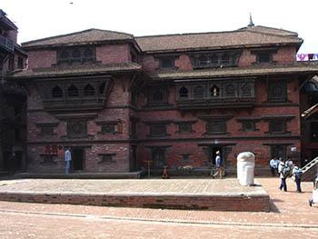 Then there is the Rameshwor Temple, and in the middle of the square the gilded statue of King Bhupatindra Malla seated on a tall stone pillar faces the most exquistitely artistic Sun Dhoka, or the golden gate, leading into the royal palace. The place is also called the "palace of 55 windows" - for the wing adjacent to the gate.